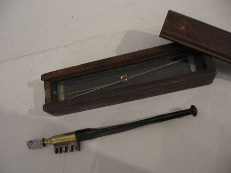Of rectangular form, the timber case supports a viewing window, showing a magnified needle, together with a Victorian hand tool.