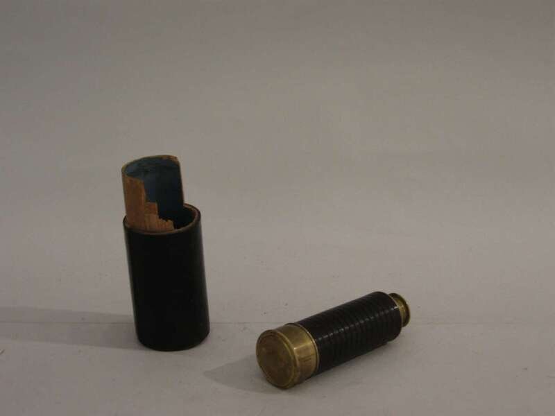 Rojs & Co. Regency Street Piccadilly, three pull draw tube, swinging cover over eye lens, 1 1/2 in subject lens, pop dust cover, tortoise shell hand grip.