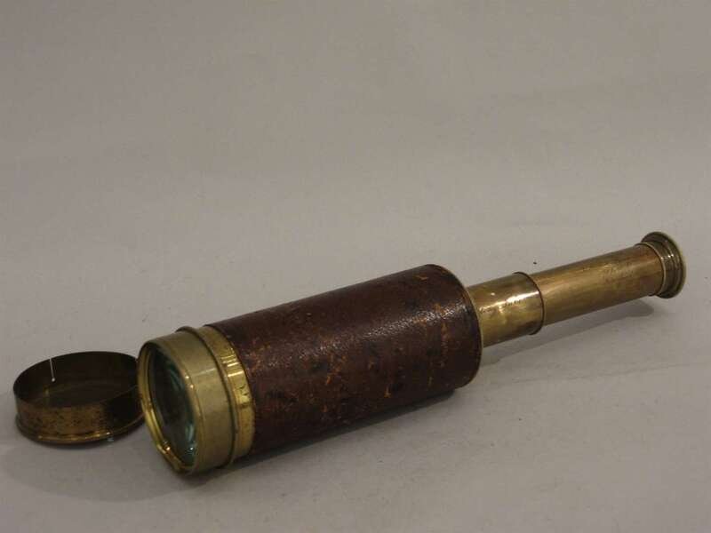 By Chadburn, leather covered hand mount, 2 1/2 in objective lens, 42 in long body-coarse focusing by ten draw pull draw tube, removable brass dust lens cover, signed.