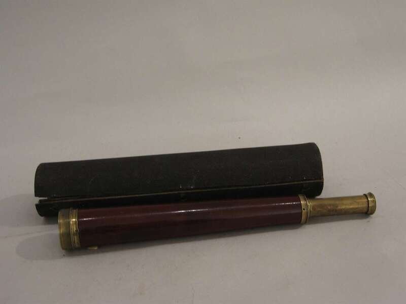 Signed Bleuler, London, with 1 1/4 objective lens, coarse focusing by pull draw tube 6 in, in a fish skin circular case.
