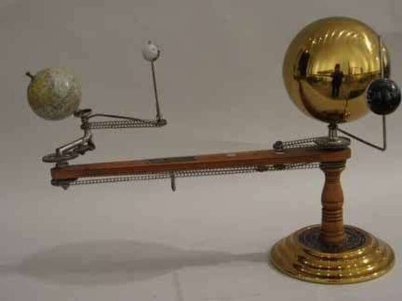 Trippensee & Co. comprising of four operating spheres, including the earth and a gilt metal sphere, the spheres orbit operated by a hand operated chain linked wheel mechanism.