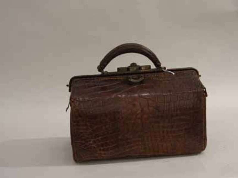 Of typical form, sloping rectangular shape, with a brass clasp and feet to base.