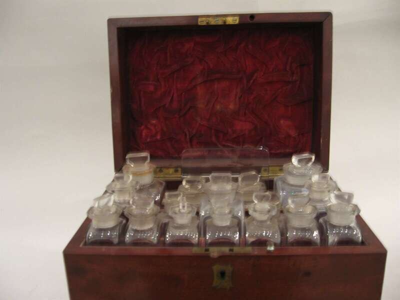 Comprising of sixteen various sized potion bottles, encased in a flame mahogany box, with a hinged lid, and false drawer.