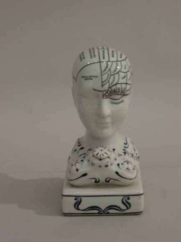 Attributed to Bennington, White porcelain, with drawn sectional scull, with a small circular covered ink well to the front of the bust, decorated with blue scroll work, together with a phrenology paper weight.