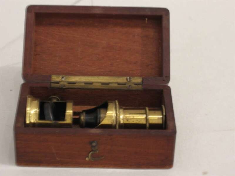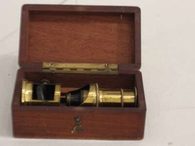 Comprising of brass viewing tube, the subject lens measures 5 mm, in a timber box.