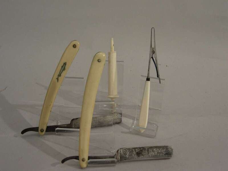 Neillo bladed switch blade, together with another switch blade, a pair of ivory handled forceps and a eye syringe.