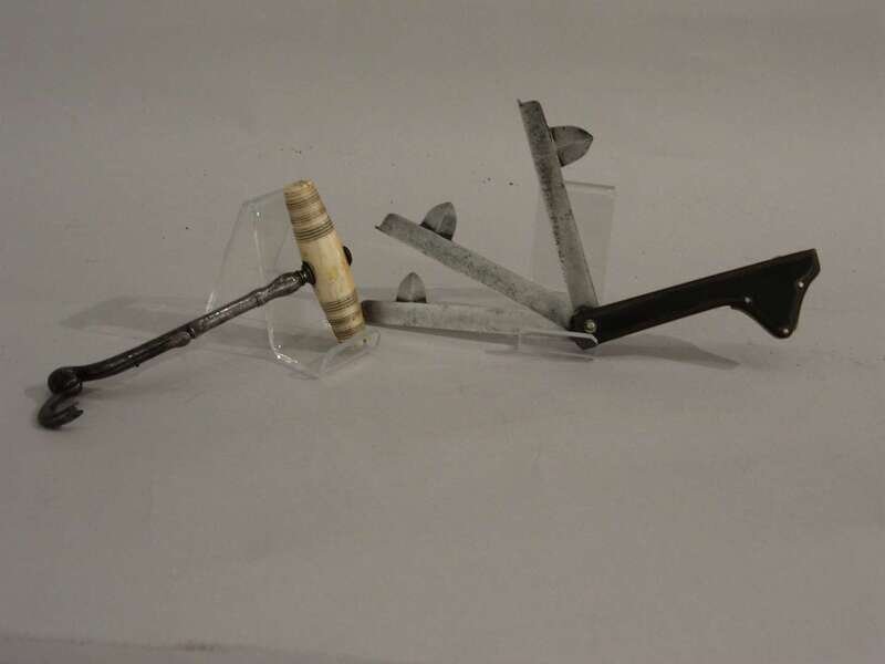 Including a ivory and iron dental key, together with a horn and steel three armed fleam.