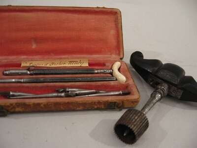 A timber and steel trephine and a French dental drill with five attachments cased in a fitted box.