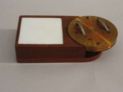 Hatters & Garnett, Manchester, the timber base is of rectangular form, with a white glass insert, the slide platform with two holding arms rotates on a circular wheel.