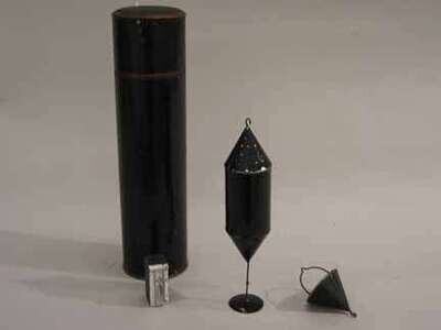 Black painted measuring device shaped as a rectangle with with two pyramids, boxed with contemporary directions.