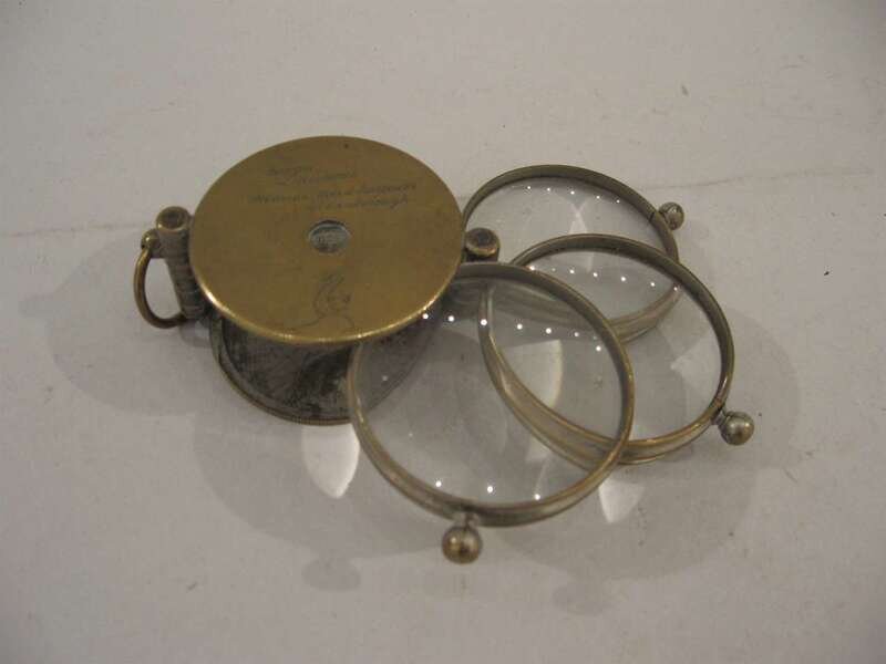 Three glasses pivoted to a brass circular mount, to be used singularly or together.