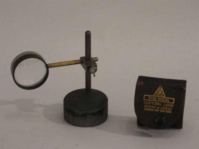 A small brass standed condensing lens, together with a copying lens, boxed.