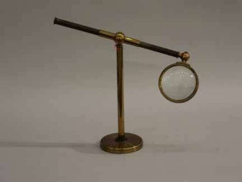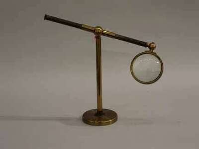 W. Ladd, London, the circular convex magnified lens sits at the end of a vertically adjusting brass arm, over a brass plated circular base.