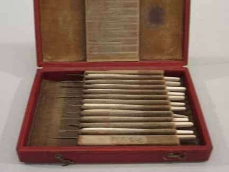 Weiss, ine steel blades are set to ivory handles, in a fitted leather box.