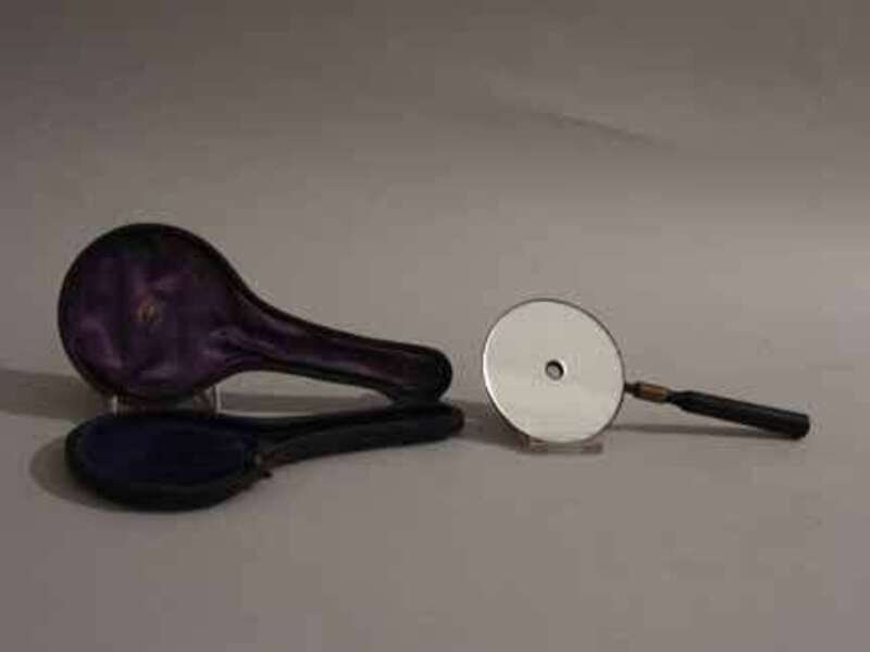 By Hawksley, the silvered scope is pieced to the center with a 1/4 in circular viewing area, supported by a timber turned handle, in a fitted leather case.