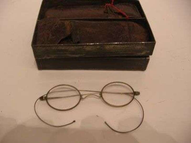 The pair of folding spectacles are in leather cases, enclosed in a tin box.