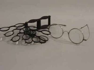 Including a horn framed optometrist trialing set, fixed with nine free swinging arms each supporting lenses of different strength, together with a large pair of theatrical spectacles.