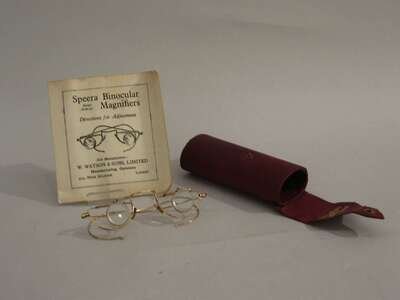 Of wire hoop eye pieces, with small highly magnified loop lens, together with a retailers case.