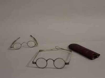 A good heavy silver pair, with circular glass lenses in a leather case, together with a pair of Indian export pair of oval lensed spectacles.