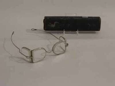 Of thick glass lenses, supported by steel arms, together with a rectangular leather case.