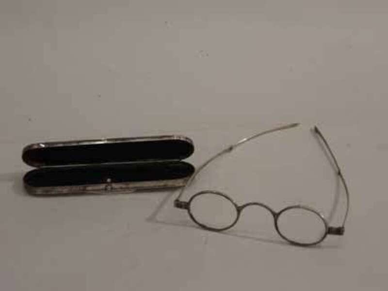 The heavy shaped rectangular case, conceals silver framed oval lensed ladies glasses.