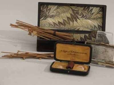A faux rosewood box, a paper scale, together with a set of early contact lens applicators.