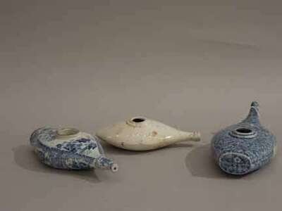 Of tapering form, one decorated in blue and white transfer, one finely painted blue and white, the other is a creamware bottle.