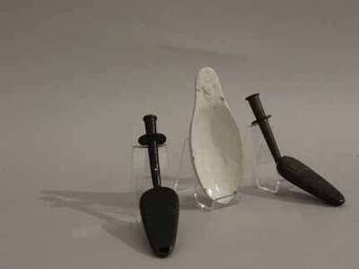 Bourne & Taylor porcelain medical spoon, together with a creamware and a glass baby feeder.