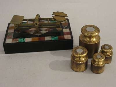 By S. Mordan, the brass pendulum scales set over a pietra dura marble plinth, together with matched weights.