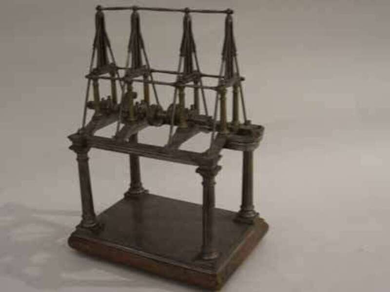 Constructed of steel and brass, the turbine arms are supported by four pillar columns over a rectangular base, over a timber platform, missing brass steam valve.