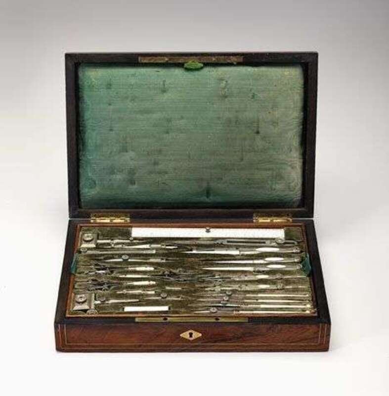 Utterly complete ivory and steel set comprising of approximately 25 pieces, including watercolors enclosed under the instrument tray, in a brass inlay rosewood box with key.