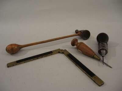 Including a ebony and brass ruler, French, two screw drivers and a hammer.