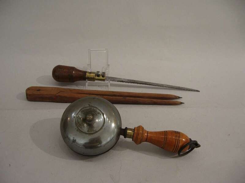 Including a American fire bell, a timber set of dividers, and a hand saw.