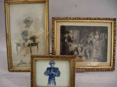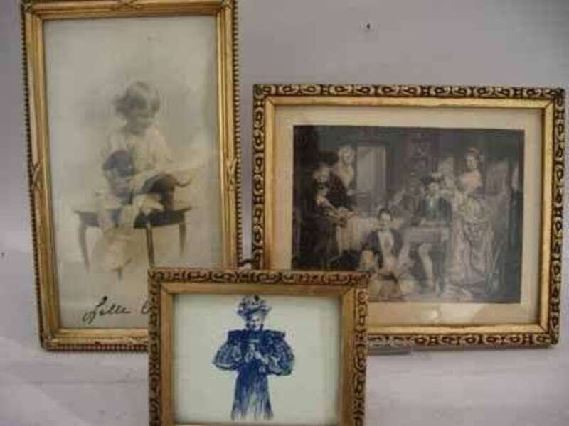 A group of three wood and gilt frames, of small stature from Denmark, two contain etched prints, and one photo signed 'Lille Carl 1913' of a young girl and her toy dog.