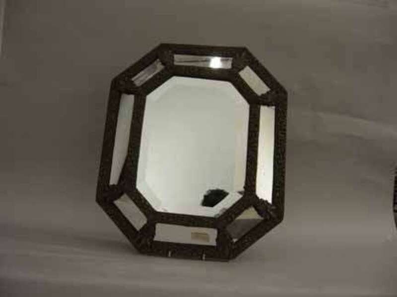 Octaganal rectangular frame, with a beveled mirror and brass paneled frame, with a central beveled mirror to the interior.