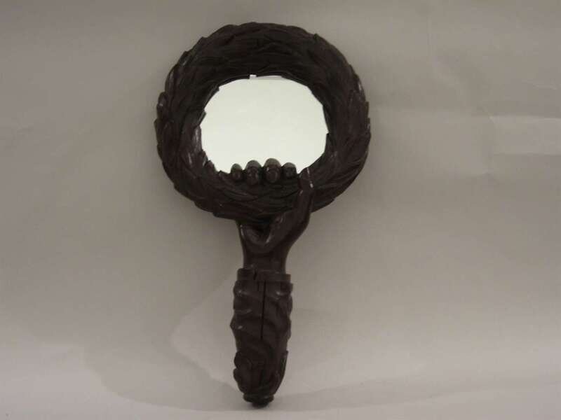 Modeled in the form of a man's hand hanging down holding a wreath of leaves, with a mirror to the center.
