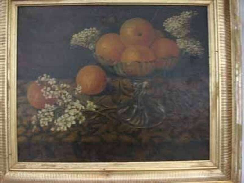 American oil on canvas painting of fruit, still life in darker hues of burnt sienna and ocher. Framed.