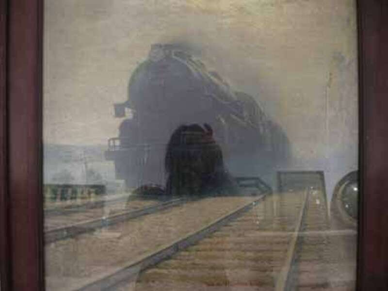 Print made from an oil painting (with unusual textured process), featured at the Massachusetts Railroad Museum depicting railroad scene from the Missouri Pacific Railroad. Framed and signed William H. Foster.