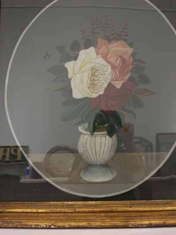Oil on board, amateur depiction of bumble bee coming to light on the petals of roses in a crudely painted vase. Framed, artist unknown.