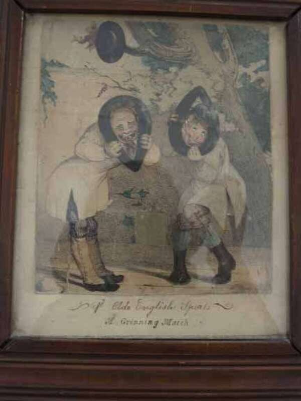 A single, framed British print hand sketched and watercolored. This unique toy has a small cork handle on the reverse that allows for the faces on the figures to change when the handle is turned. Inscribed as 'A grinning match', matted and framed.