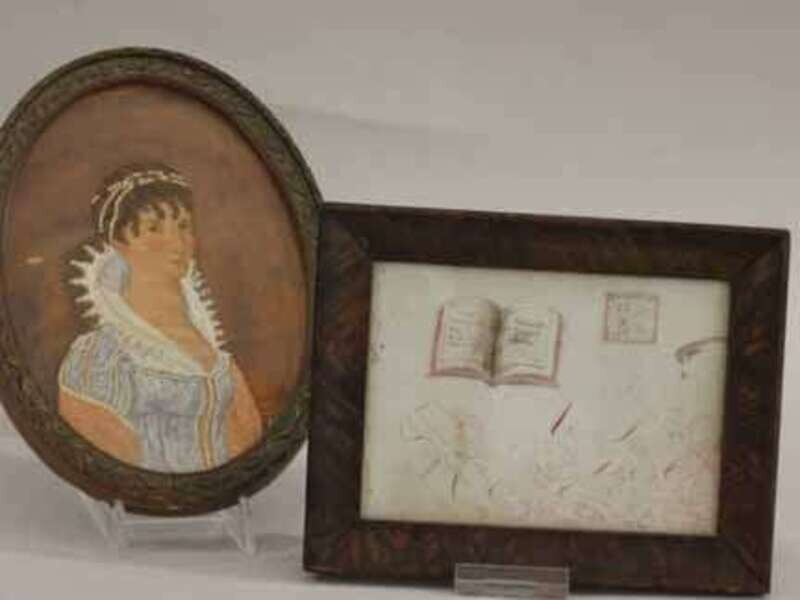 Delicately embroidered needle point in pastels of the Empress Josephine of France seated in fancy dress. Facial features have been painted onto the silk backing. Smaller postcard sized, practice calligraphy done by a Chinese student at the Wilbraham Academy, dated February 5th, 1873. Both framed, artists unknown.
