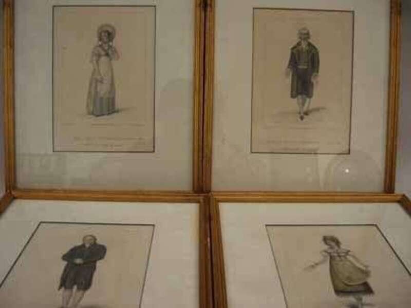 A group of four theatrical prints ecthed by F. Waldeck, and then painted lightly with watercolor.