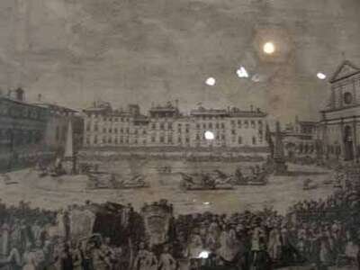 Two etched landscape prints of bustling Piazza scenes, chariot races and promenades. Both framed, artists unknown.