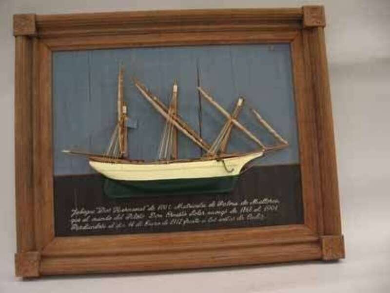 A rustic, hand made depiction of a Spanish sailboat, sails turned in resting above the inscription, "Jabeque 'Dos Hermanas' de 100t. Matricula de Palma de Mallorca qu al mando del Piloto Don Ernesto Soler navego de 1868 al 1901 Perdiendose el dia 14 de Enero de 1912 frent a las costas de Cadiz". In memoriam of Captain Enesto Soler, made of light weight wood and linen. Framed, artist unknown.