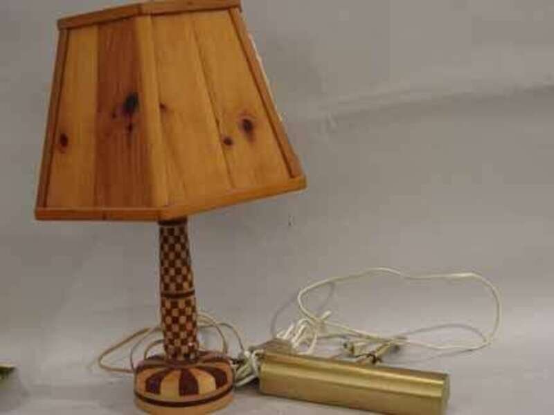 The timber lamp includes a timber shade and parquetry column, together with a brass plated wall bracket lamp.