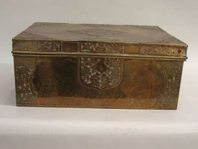 Of rectangular form with a hinged cover, handle to each side, applied with Chinese pieced motifs.