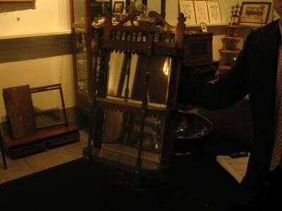 Comprising of three shelves, terminating in a pieced top and bottom chest, two beveled mirrors to the interior.