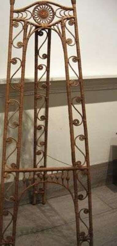 The tall slender easel, is worked with two acorn form finials to the scrolling support columns.