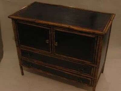 Transfer and black painted panels, bamboo edged drawers, two doors over two long drawers.
