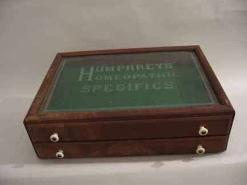 For Humphreys Homoeopathic, with a glass covered cabinet top over two long drawers.